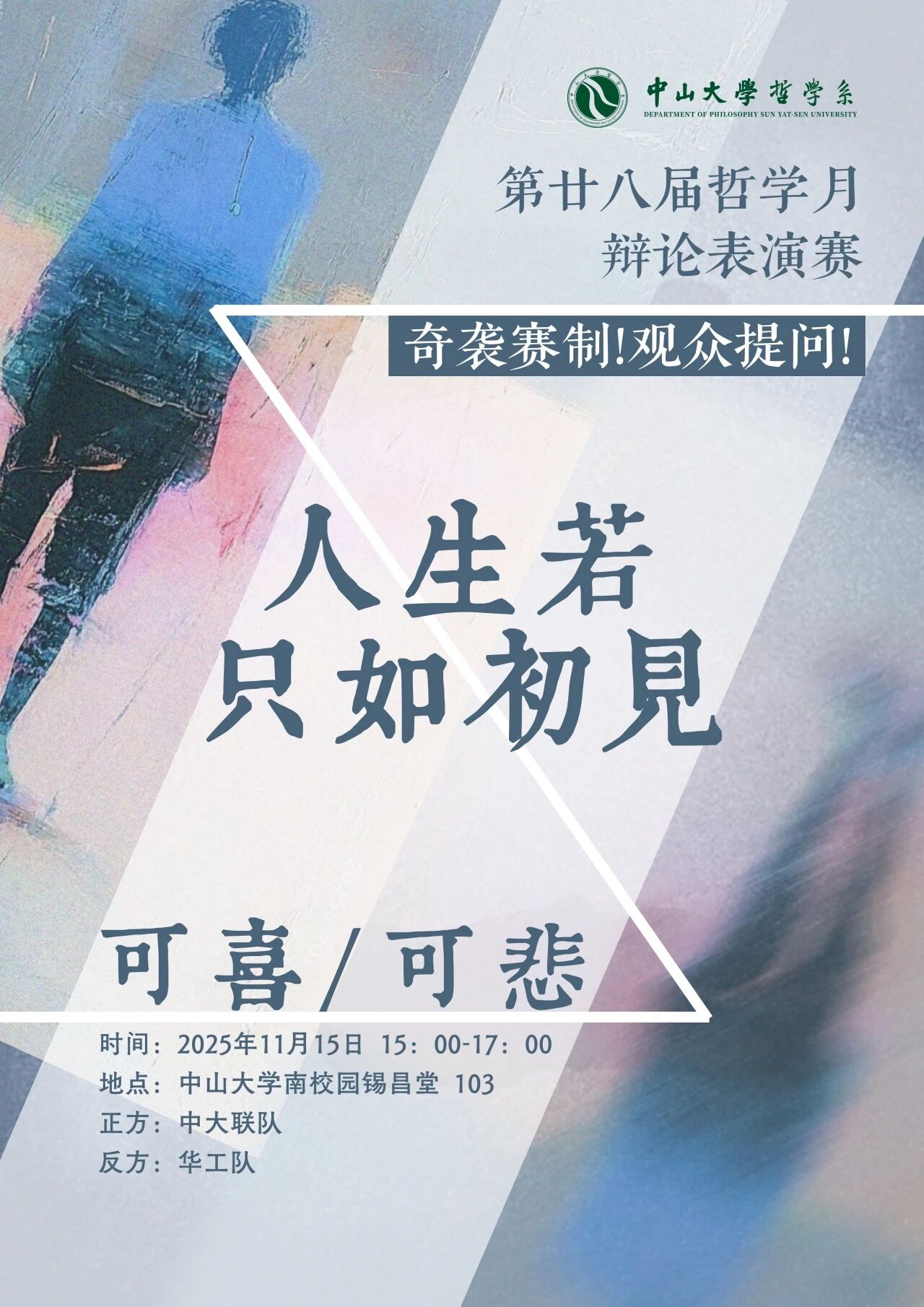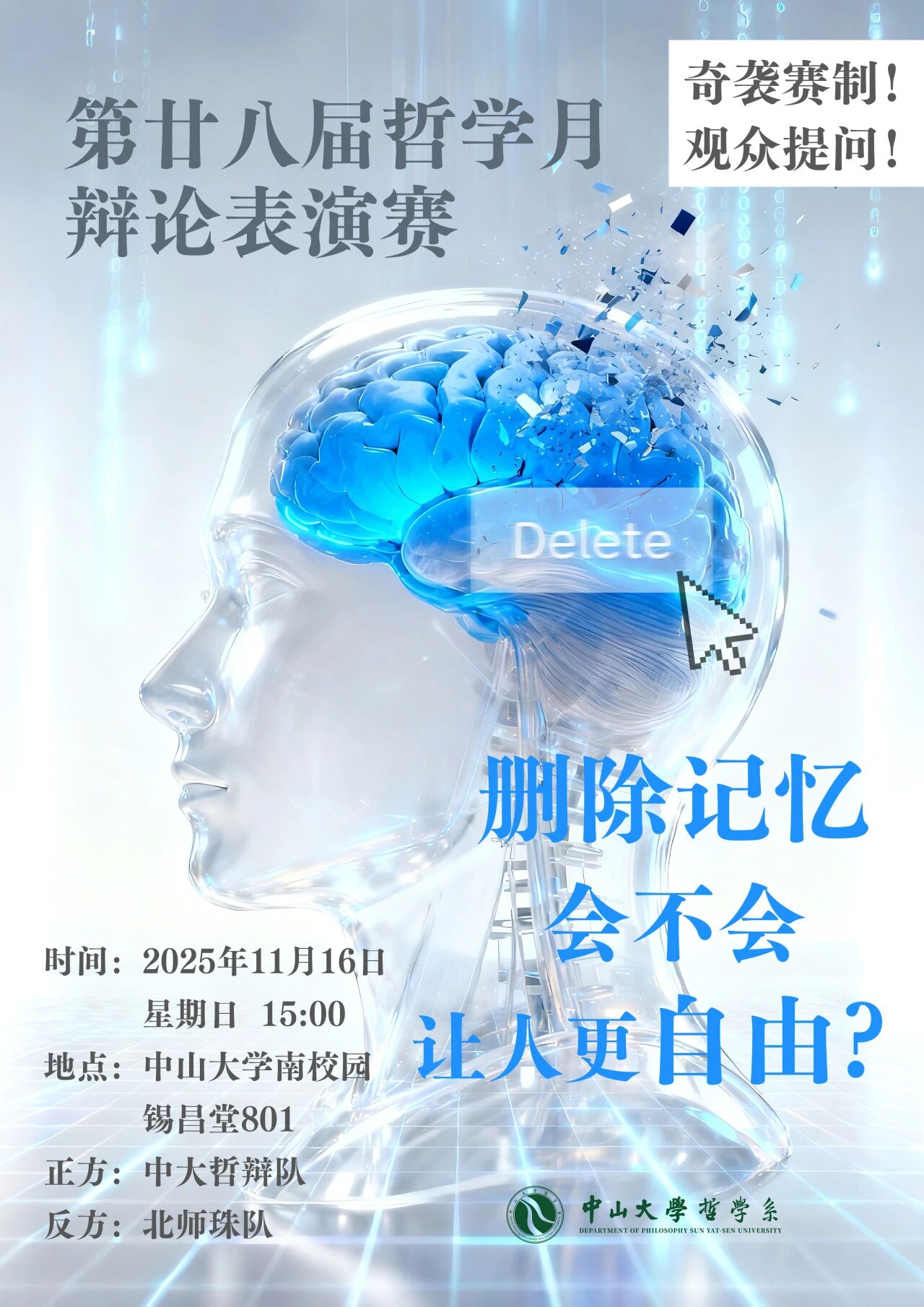第28届哲学月辩论表演赛,我们荣幸邀请北京师范大学珠海校区与华南理工大学的辩论精英,与中山大学的辩手联袂出场。本届赛事,我们将从【科学哲学】的宏大命题,辩至【人生初见】的幽微情感,以逻辑为舟,以言语为桨,航行于哲思的无垠之境。