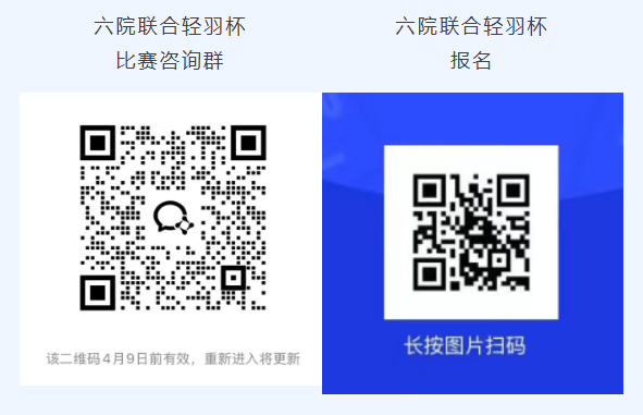 请扫描下方二维码进入咨询群,获取报名问卷及后续通知。报名问卷将于4月5日12:00正式开放,请有意参赛的同学按时填写。报名成功后,工作人员将根据项目情况进一步通知并建立正式参赛群。组队形式为师生自由组队,可跨院系组队,每人最多报名两项。单打项目原则上每项上限32支,双打项目原则上每项上限16支。